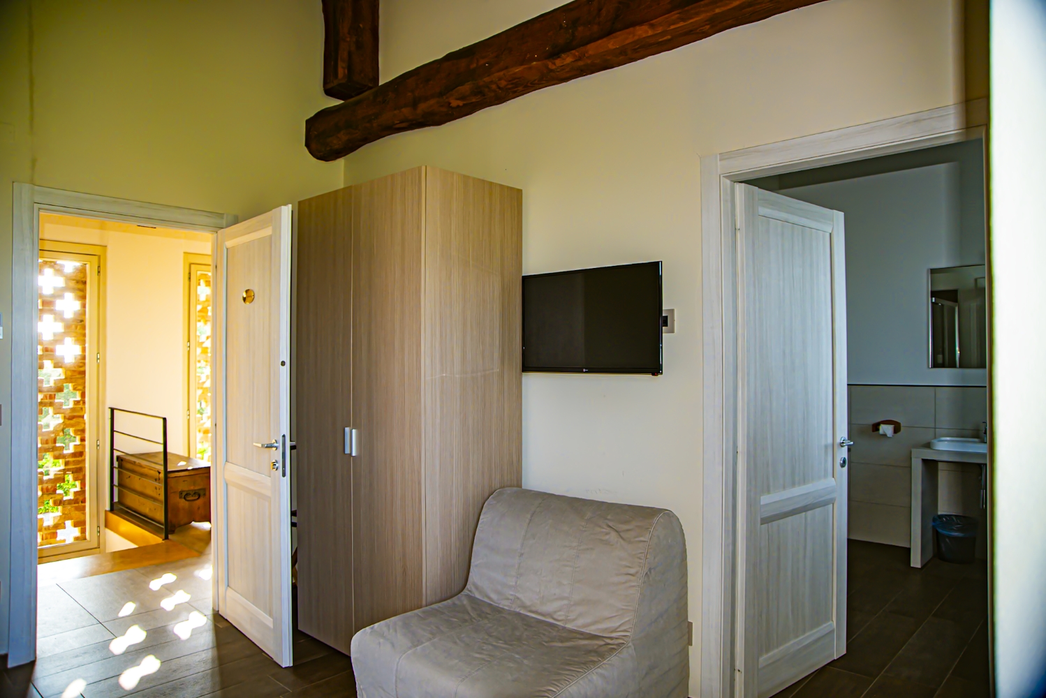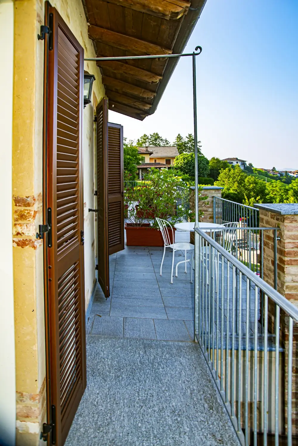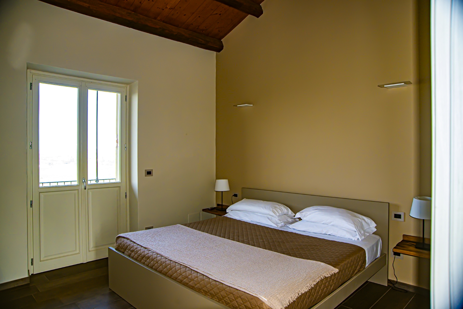 Located in the White Grape Wing, this comfortable king-size bedroom features exposed wooden beams. Double doors open onto a private terrace overlooking the Ca Rapulin estate vineyards. An additional single bed can be arranged upon request.