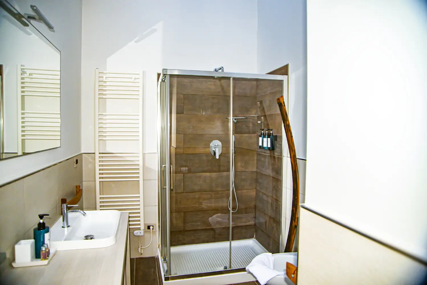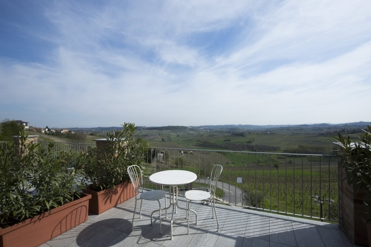 Located in the White Grape Wing, this luxurious king-size bedroom features exposed wooden beams and a spacious bathroom. Double doors open onto a large terrace with a panoramic view over the vineyards.